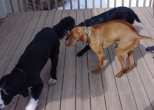 Corki and Freya playing "tug". That is, Freya tugs Corki.Video 1 Video 2 03/19/2001 |